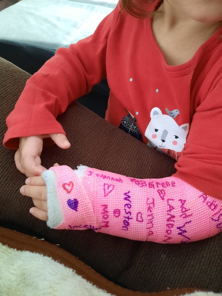 Our youngest managed to be our first girl with a broken bone this month. A very swift, completely unexpected fall off a bed with daddy right there happened at bedtime one evening. She calmed and fell asleep quickly so a visit to the ER happened the following morning. Both bones in her forearm broken. It took 3 casts and painful resets to get it where the IWK Children’s Hospital was satisfied to leave it for the week, before seeing her in person. A heavy plaster cast and a busy 21 month old that still thinks she’s invincible is not fun. She still wanted to climb everything but was thrown off balance by her new addition.