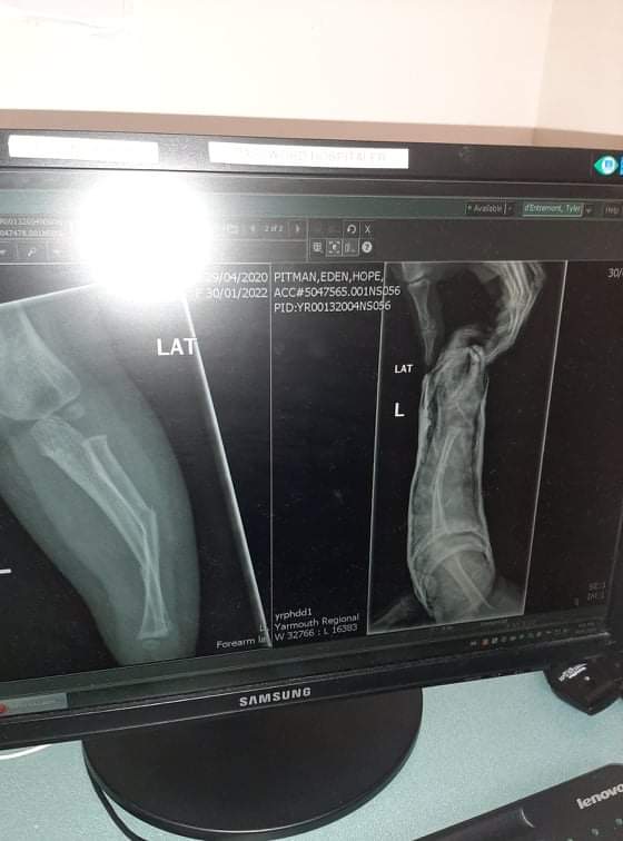 A week later, she was seen at the IWK. A new xray, cast removed, reset a tiny bit then recast in a smaller, lighter fiberglass cast, covered in bright pink. She was a great little trooper with a long day of driving. Thankful for Peppa! Lol